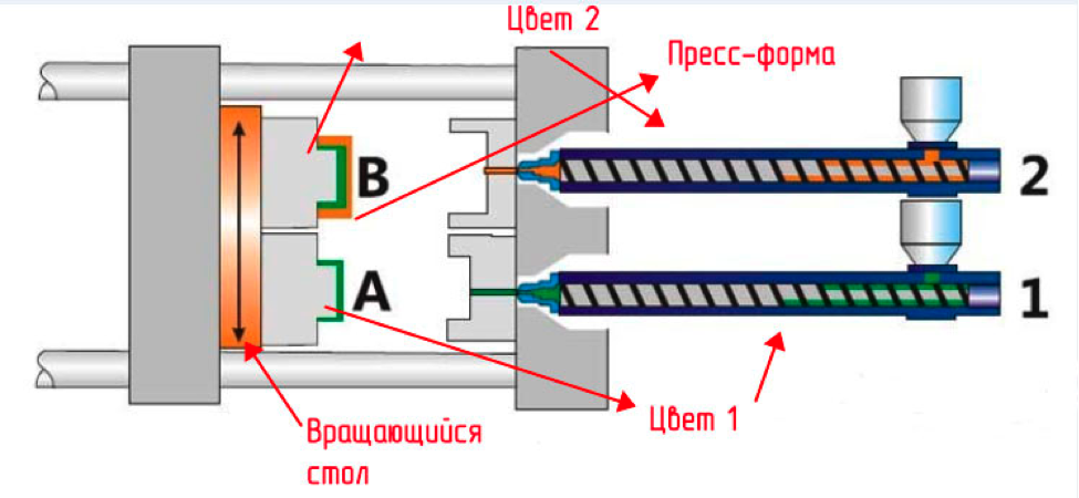 Двухцветное литья и двухкомпонентное литья являесть впрыснуть два цвет или два материал в одном продкте с помощью литьевых машин с два узела впрыска сырьё, поворотной плитой или ,и с использованием пресс-формы различной конструкция (с перемещающейся части, подвижные знаки, поворотные устройства и т.д.)